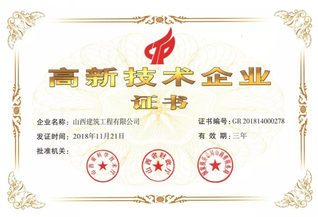 近日,山西建投建工集团荣获山西省科技厅、山西省财政厅、国家税务总局山西省税务局联合下发的《国家高新技术企业证书》。